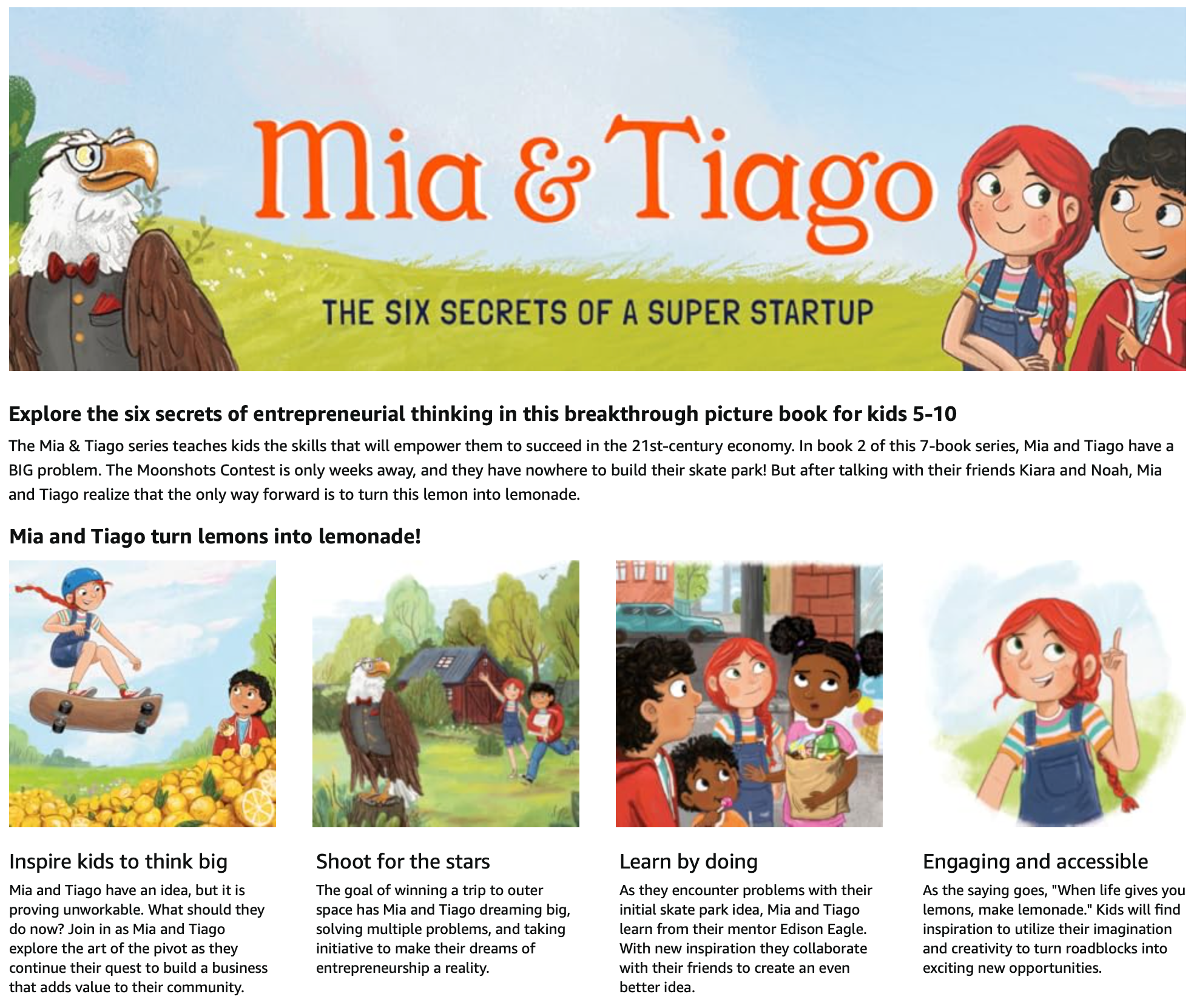 "The Mia & Tiago books are a unique treasure for schools and parents who want to teach their children how to think like an entrepreneur. Instead of simply giving kids a business idea to copy, Mia & Tiago actually help kids unlock and act on new ideas they create themselves using principles that are based on decades of research into expert entrepreneurs." - Jim Zuffoletti, serial entrepreneur, co-founder of SafeGuard Cyber and OpenQ