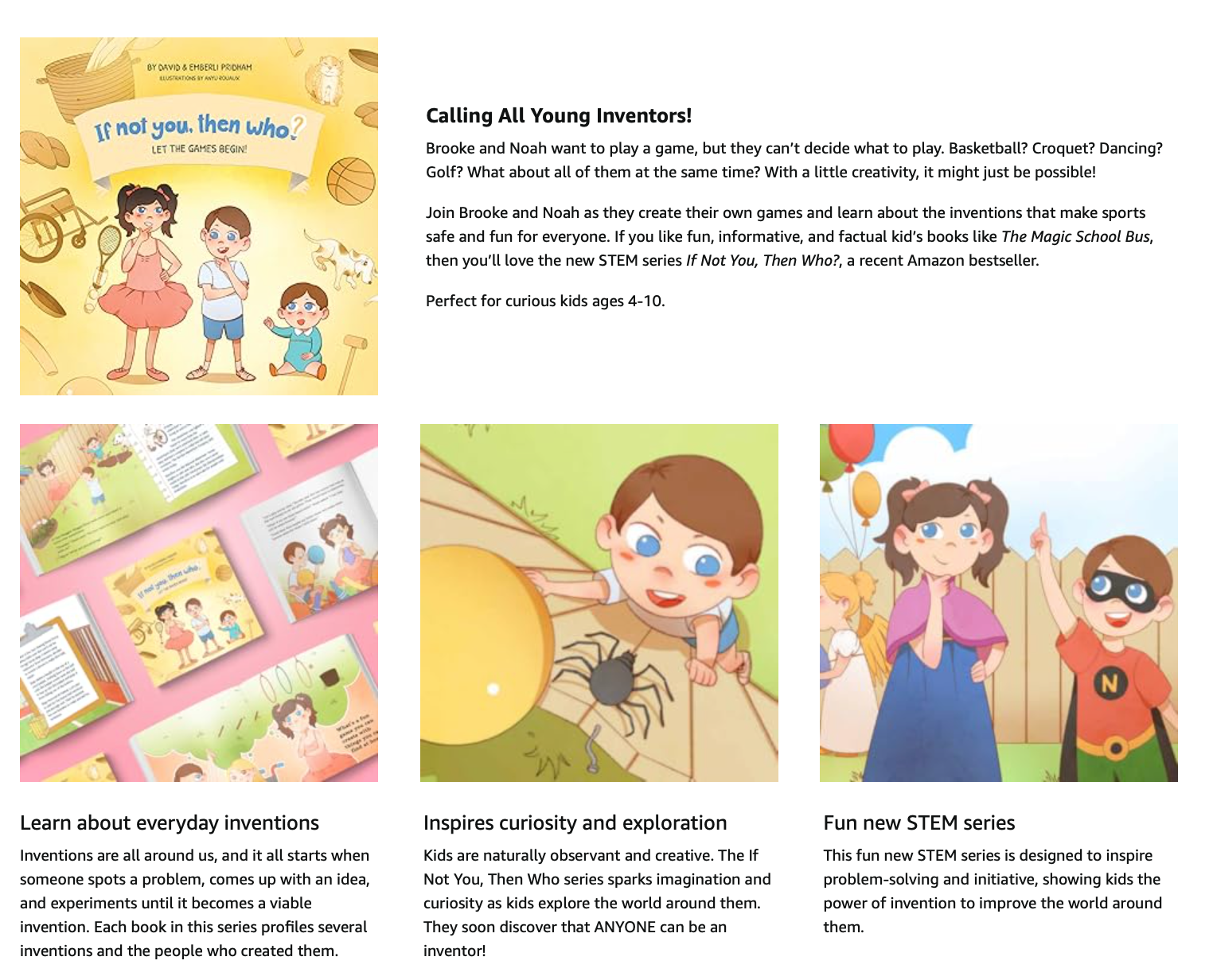 "In If Not You, Then Who (Weeva), a new multi-book STEM series targeted at ages 4 to 8, authors David and Emberli Pridham do a most convincing job teaching children about the inventions and patents in everyday life...Fascinating facts and fun learning are what these books are all about. When the authors ask what inventions Brooke could devise to make her daily tasks easier, great illustrations clearly make the point!"