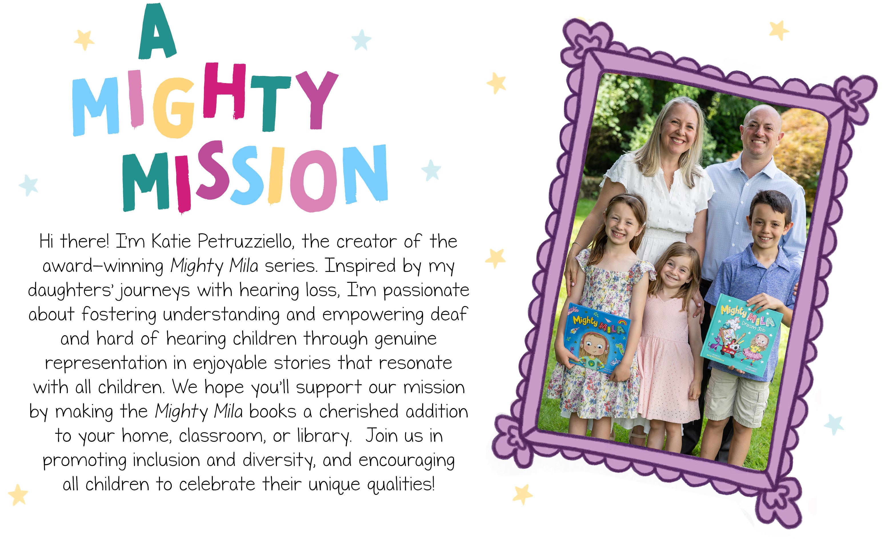 "Mighty Mila by Katie Petruzziello was an inspiring, fast-paced, and well-written story... Not only is the story full of important lessons, but it is also filled with helpful details about Mila's cochlear implants... Reading this wonderful tale, I was immediately attracted to the main character, Mila, who was a ball of sunshine throughout the story. I admired how strong-willed she was when she wanted to prove something to her family. Children will surely enjoy and also learn a lot from Mila's adventures!" - Trisha Dawn for Readers' Favorite (5 Star Review)