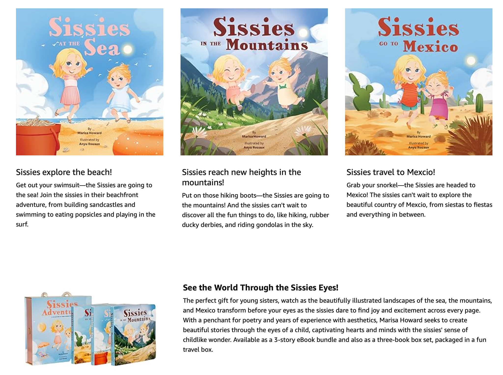 Marisa Howard is a children’s book author who resides in Dallas, Texas with her husband and two daughters. With a penchant for poetry and years of experience with aesthetics, she seeks to create beautiful stories through the eyes of a child, based off of travel and adventure. In sharing the joy of exploration with young readers, she hopes that the bonds of sisterhood shine through the short stories and illuminate how having a sister is one of life’s most precious gifts.