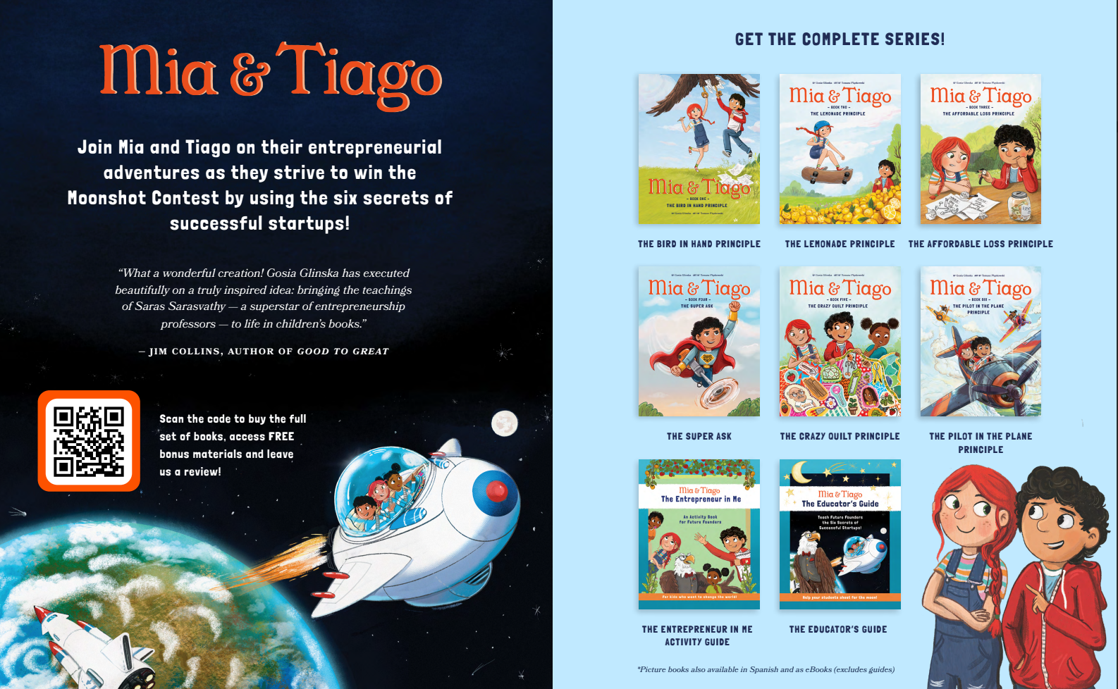 "The Mia & Tiago books are a unique treasure for schools and parents who want to teach their children how to think like an entrepreneur. Instead of simply giving kids a business idea to copy, Mia & Tiago actually help kids unlock and act on new ideas they create themselves using principles that are based on decades of research into expert entrepreneurs." - Jim Zuffoletti, serial entrepreneur, co-founder of SafeGuard Cyber and OpenQ