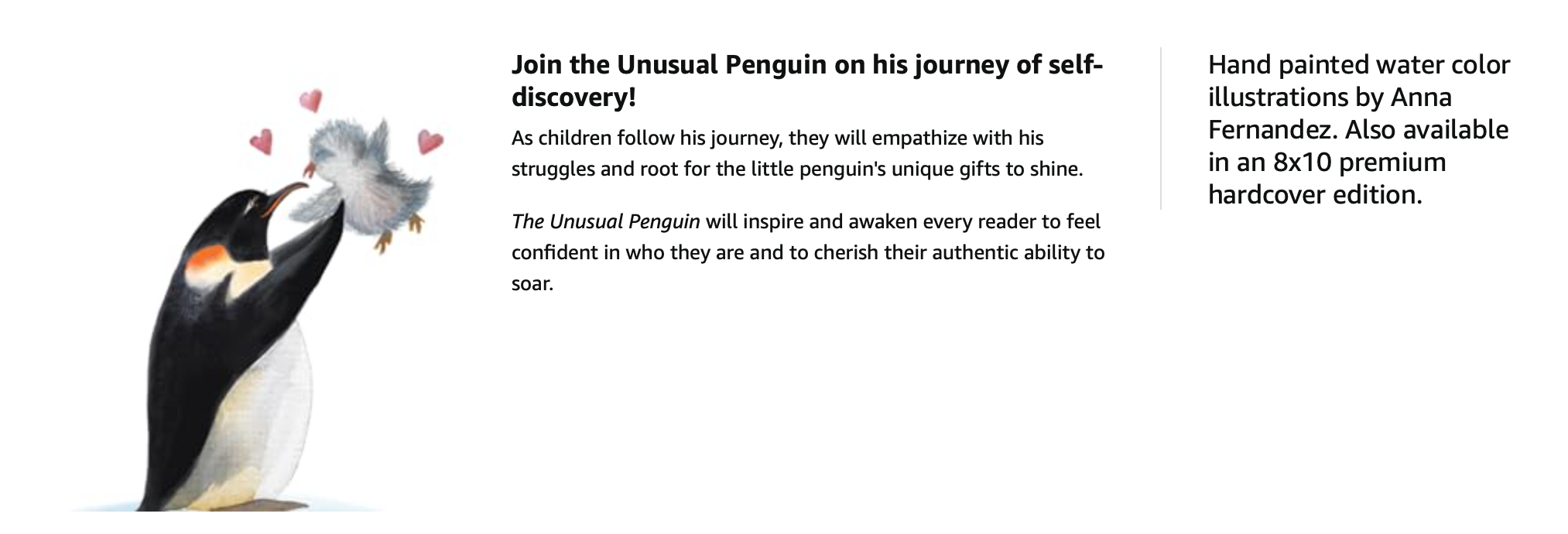 Found out in the snow all alone, a scruffy gray penguin hatches from its egg and, with a "sloppy" tux and "gangly" feet, struggles to fit in with his penguin classmates, until one day he spies someone who looks like him and discovers that perhaps he isn't the odd penguin out-maybe he's something else altogether. This uplifting picture book about accepting yourself and celebrating differences is rendered in lush traditional watercolors, with the texture and character of Anna Fernandez's illustrations adding emotional depth to The Unusual Penguin's heartwarming message, sure to delight caregivers and reassure their young loved ones who may feel different themselves. - BookLife by Publisher's Weekly