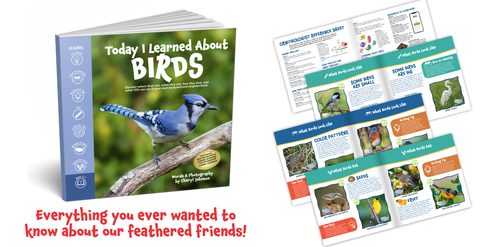Today I Learned About Birds by Cheryl Johnson is a beautiful and fascinating book that introduces children to the wonderful and exciting world of birding. Cheryl explains everything a young birder needs to know concerning birds including where they live, their various habitats and ecosystems, tools used in birding, descriptions of some of the more common birds, how to look for birds, and many more useful facts. I cannot recommend this book highly enough. It is beyond great! Although it is written to stimulate a child's interest in birding, the book will capture the parent's attention as well. That is because Cheryl includes some amazing photographs of various bird species. She teaches about birding most delightfully so children will want to learn all they can about birds. She also educates about endangered birds and how you and your children can help them survive by making your yard bird-friendly. It will give you and your child many hours of enjoyment as you learn about birds.